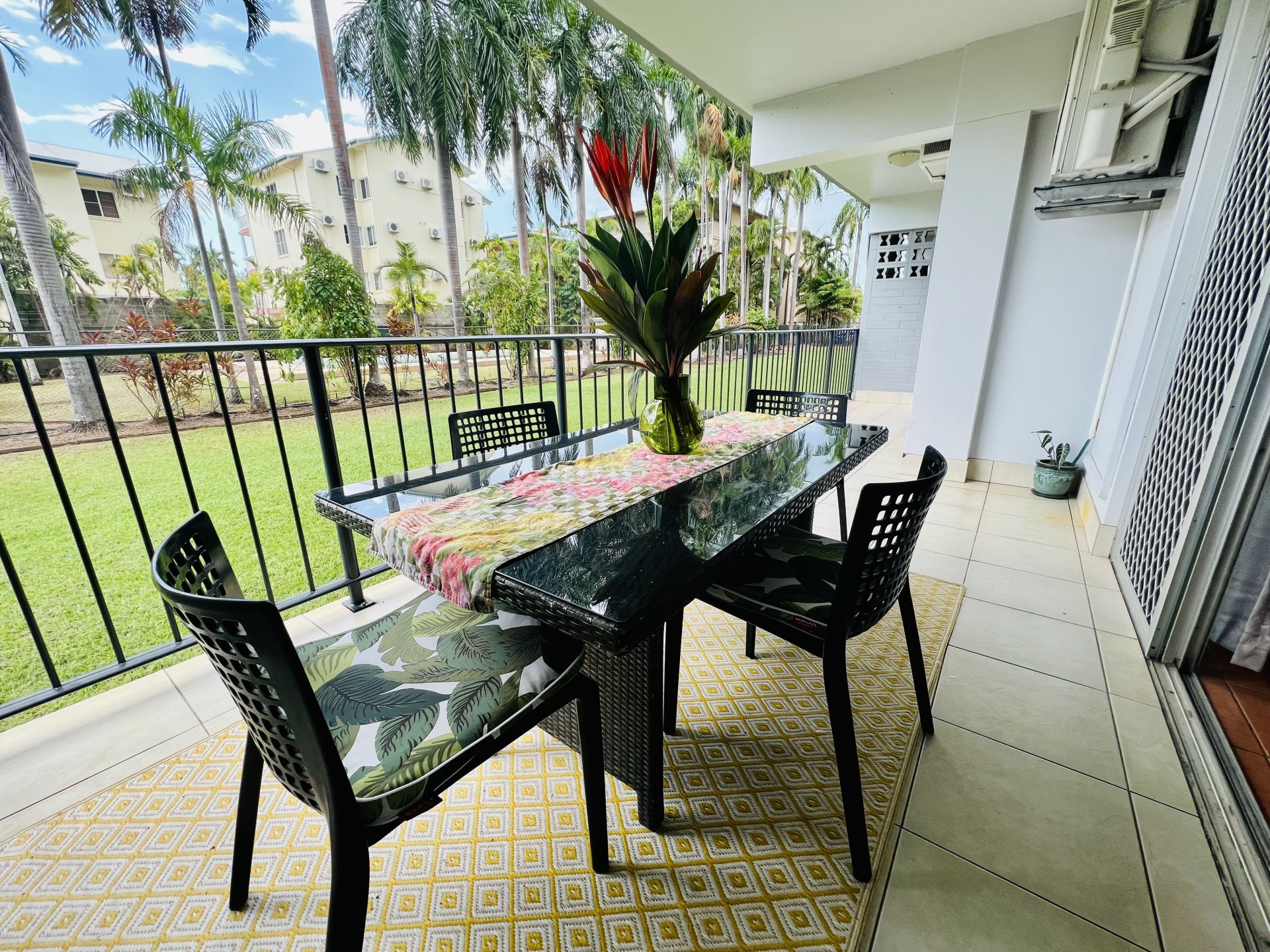 A large tiled private balcony overlooking green lawns and tropical gardens provides a great space for outdoor dining.