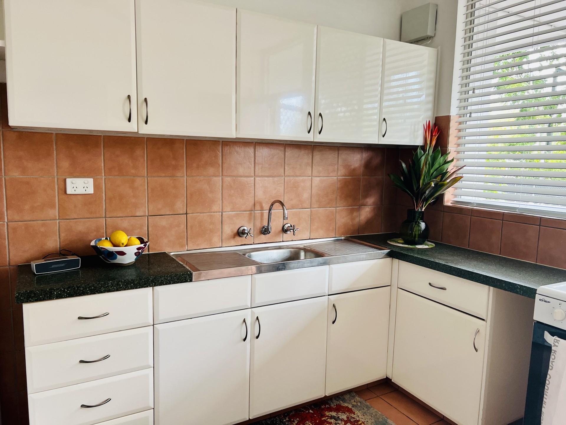 The open plan kitchen, dining and living area is tiled with new window furnishings throughout, and secure screens allow for sea breezes to cool the home with light airy windows.