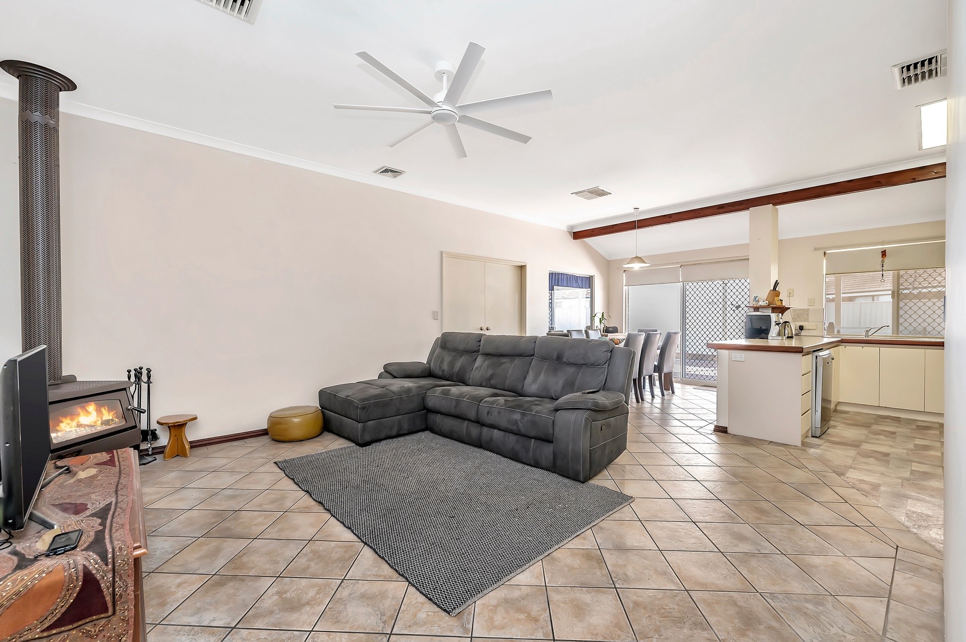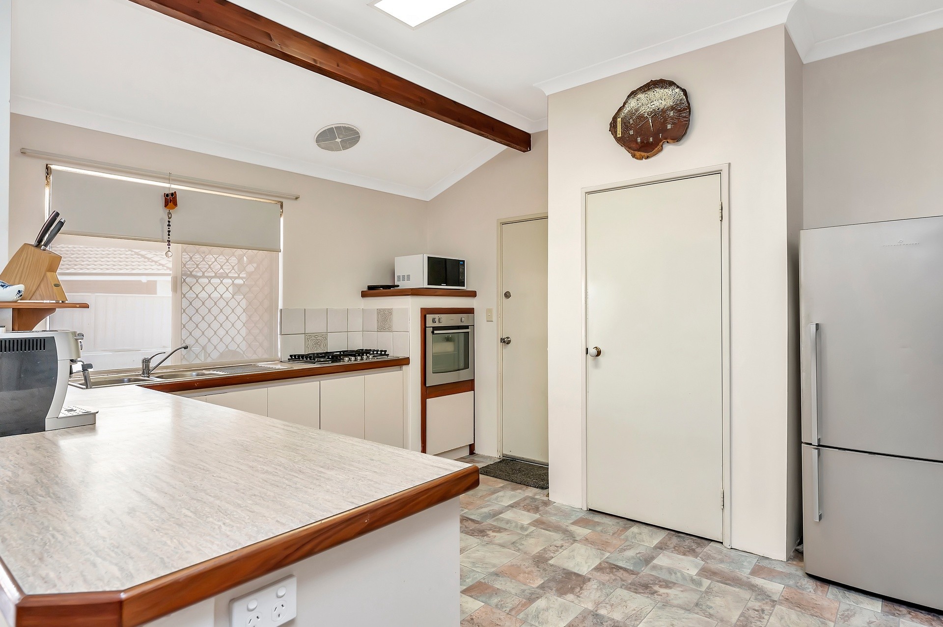 The functional kitchen is fitted with stainless steel appliances, electric oven, 5-burner gas stove (with wok burner) and a dishwasher. Bench space for days that can be utilized as a breakfast bar will see you never run out of cooking prep room. Power points have been strategically placed underside of the bench for full flexibility and convenience. The fridge space will take the largest of fridges and there's a shopper's entrance door.