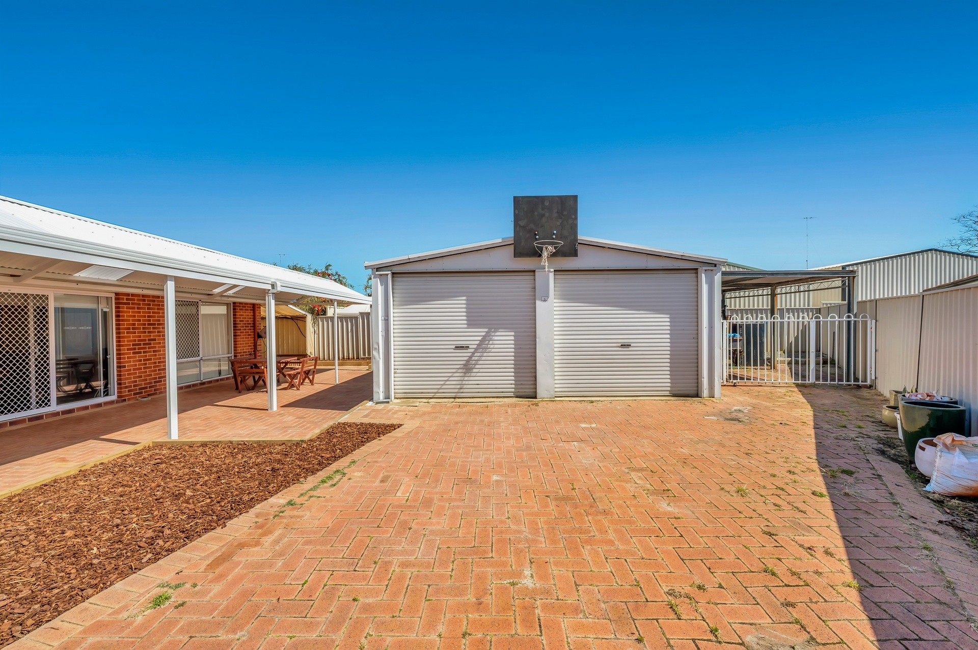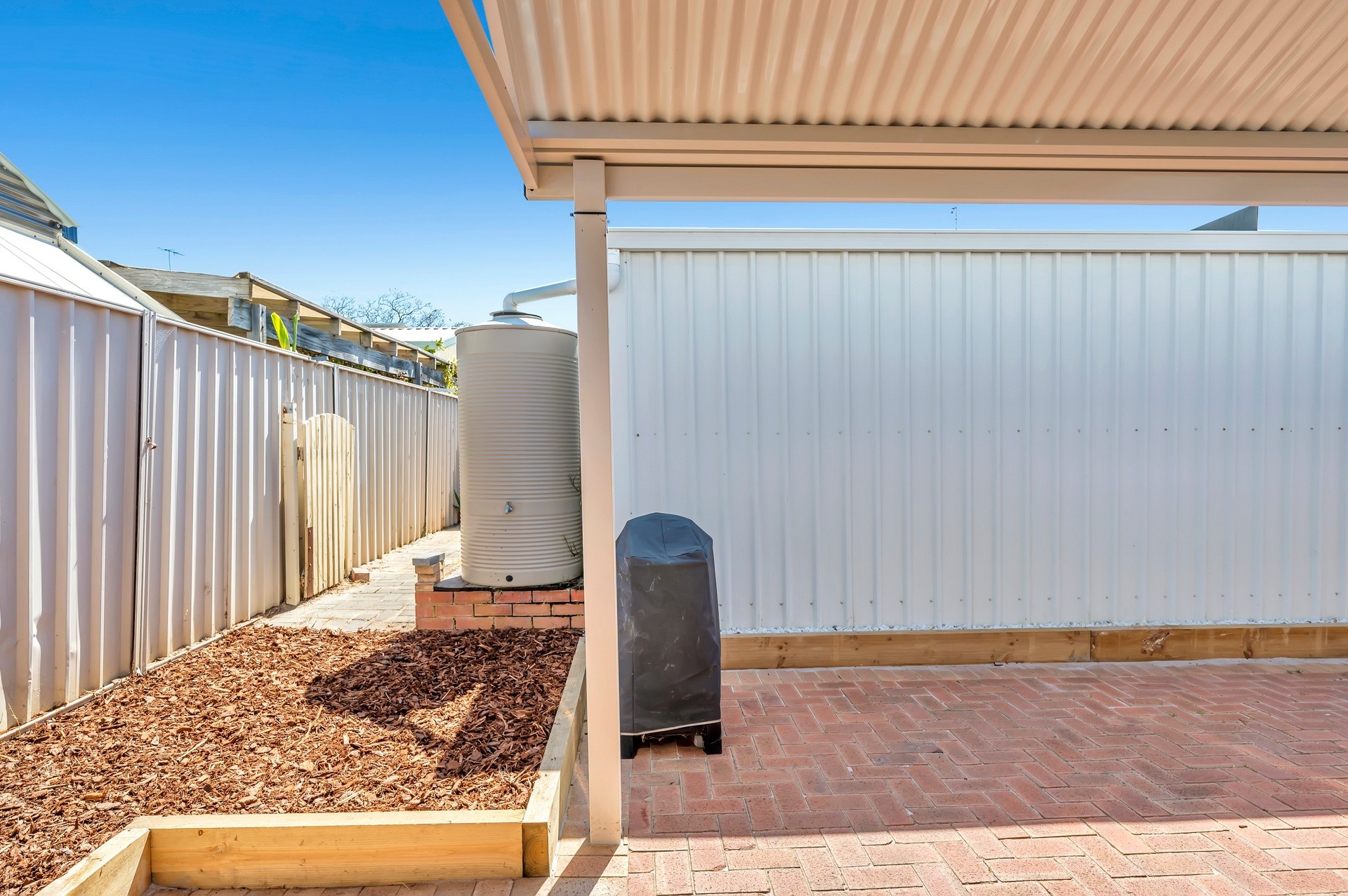 Outside you will find the undercover alfresco area with an expansive 10metre colourbond patio. The positioning here captures the ocean breezes through the summer months and is big enough to provide dry and comfy outdoor space during winter. With such a huge area to work with, the possibilities here are endless and just waiting for your personal touch. There is a natural gas bayonet for BBQ or heater, and a fitted outdoor power point.