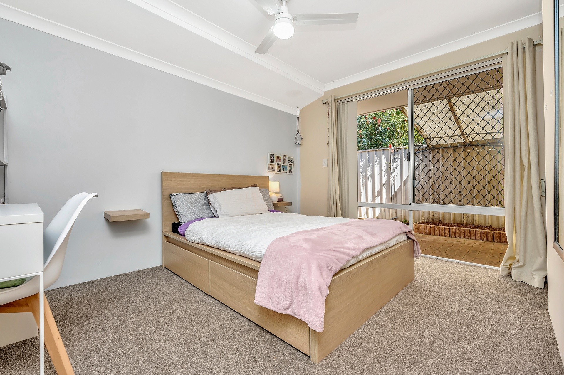 On the left is the HUGE King-size master bedroom with carpet underfoot and a fantastic study nook, perfect to work-from-home.