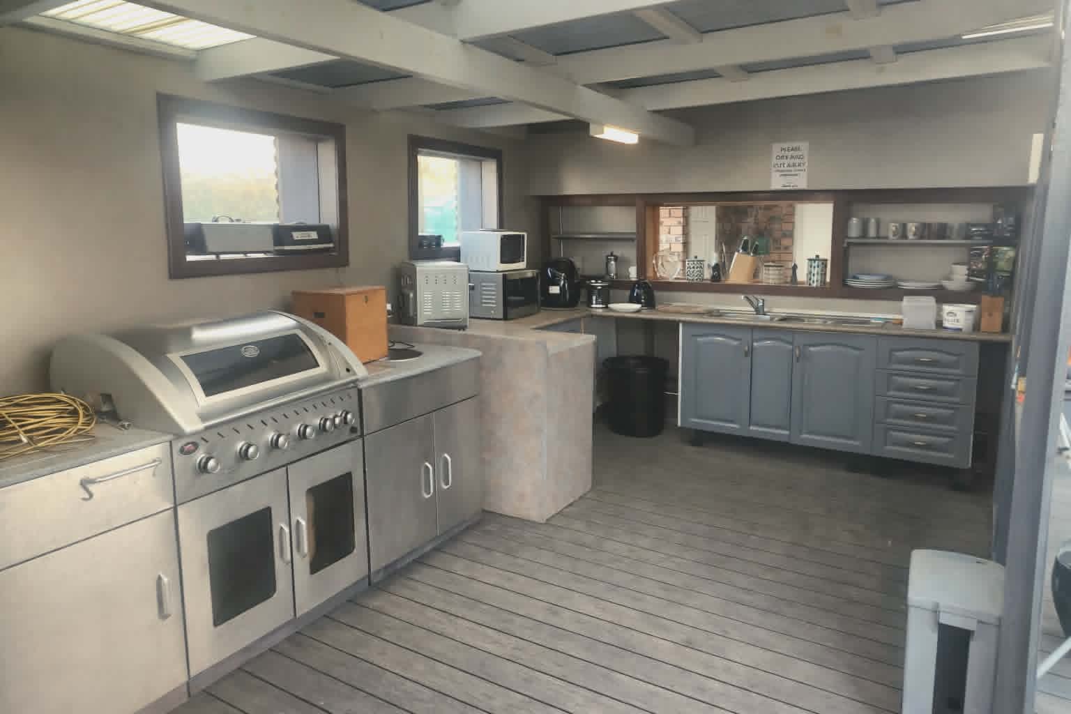 There is a huge stainless steel fully equipped outdoor kitchen.