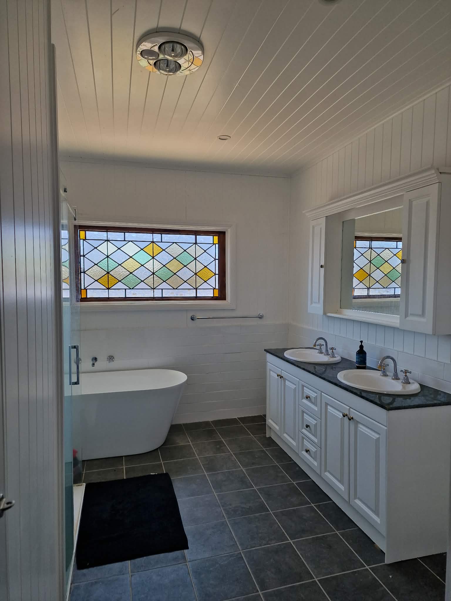 There are four bedrooms in total; two double bedrooms have custom built-ins serviced by a full bathroom, accessed through a hallway that houses large linen storage cupboards.