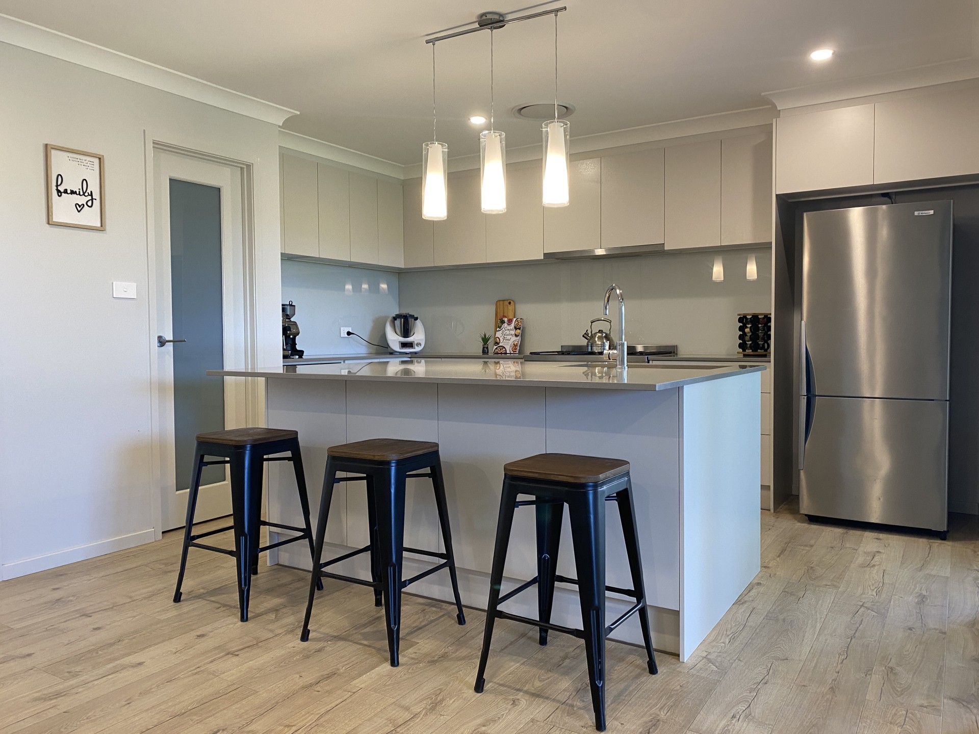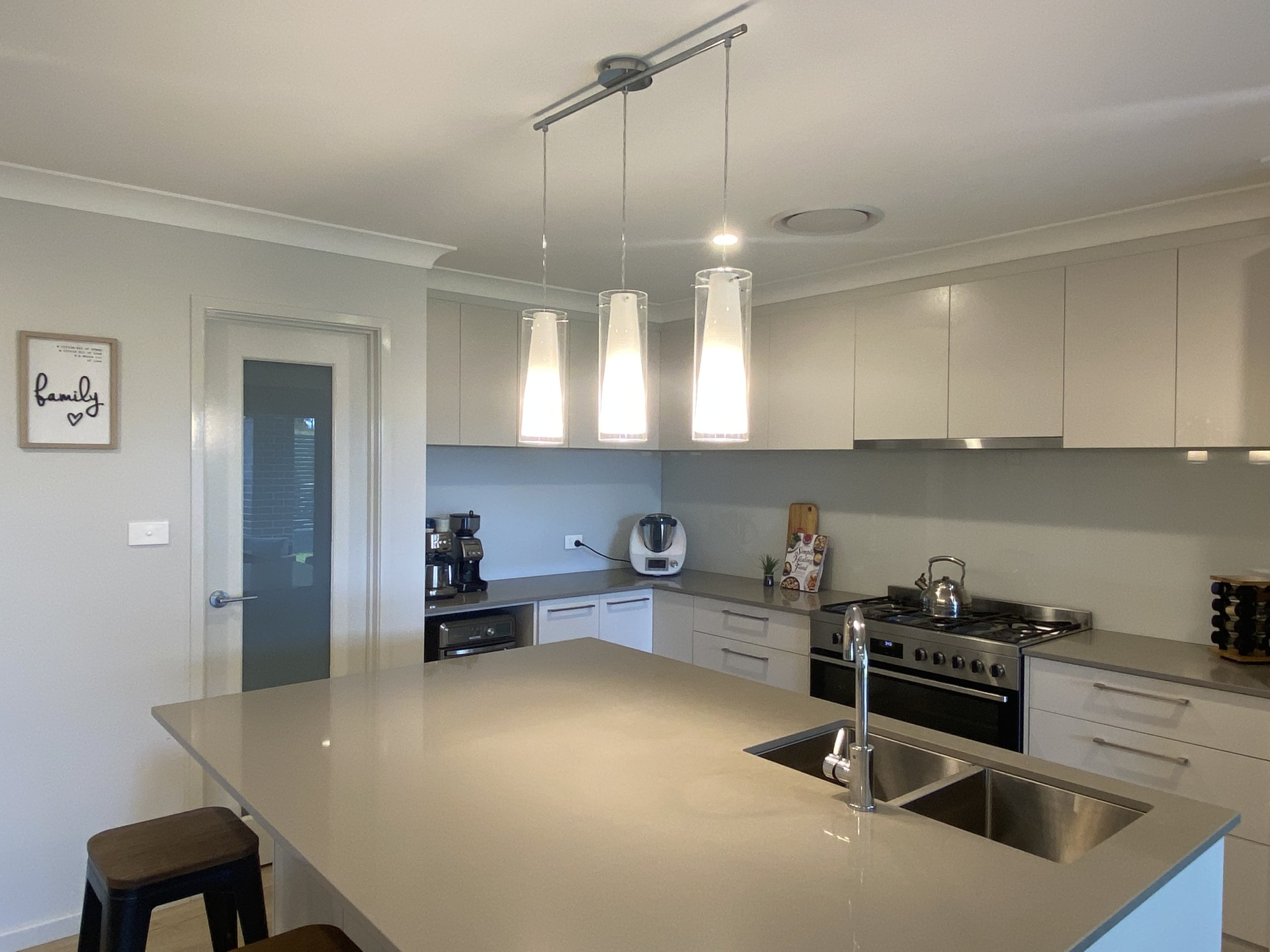 - Modern kitchen with wide island bench and 20mm caesarstone tops.
