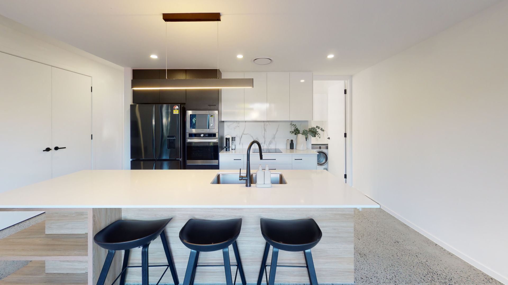 Serving as the hub of daily life is the ground-floor's open-plan kitchen, dining and living room with direct access to the poolside patio. For the eager cook, there's a centre kitchen island and a suite of premium appliances while polished concrete floors, crisp white walls and flawless finishes only add to the contemporary appeal.