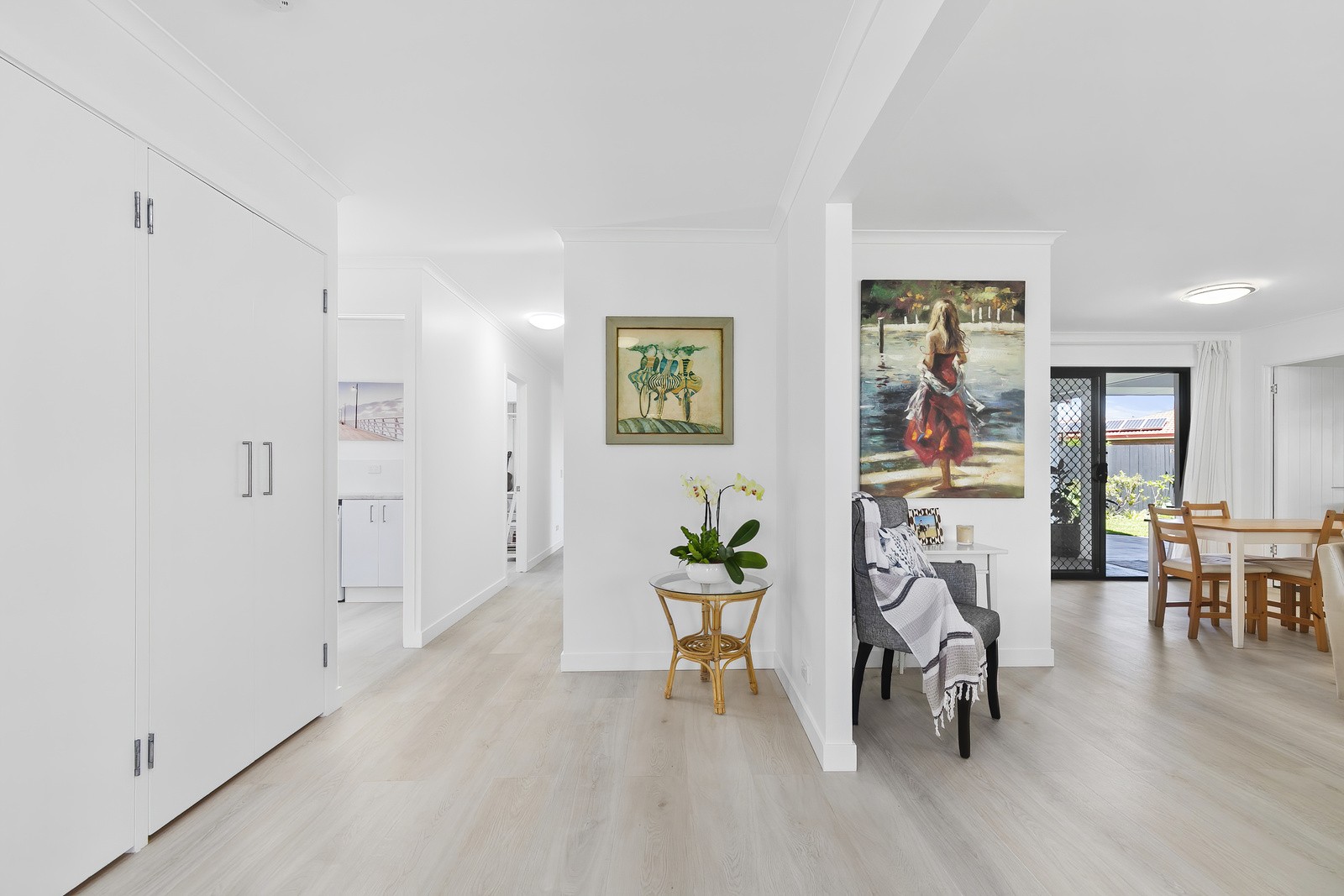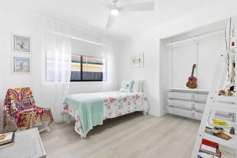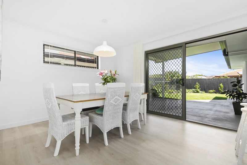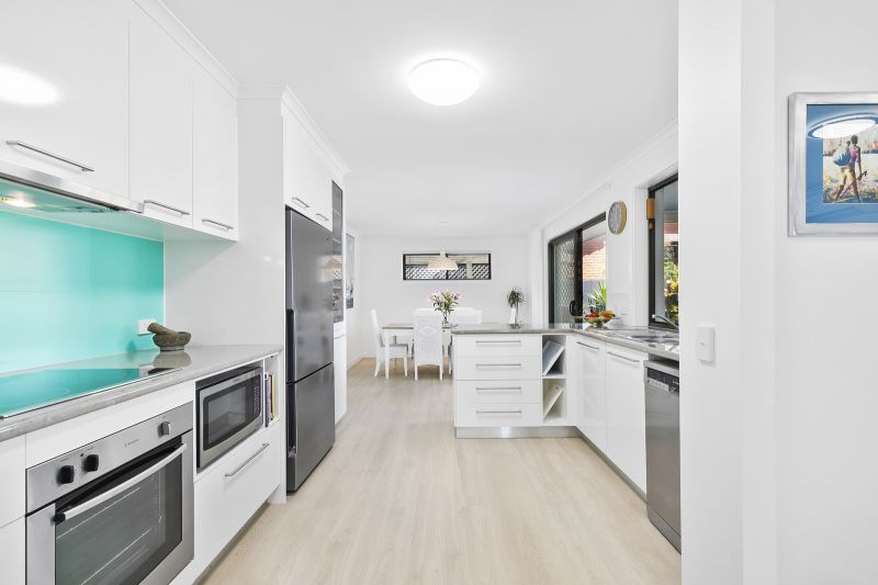 The kitchen at the heart of the home is modern with plenty of cupboards, including pantry, dishwasher and electric cooktop. Open plan dining and adjacent living rooms open onto the large undercover rear entertaining area.