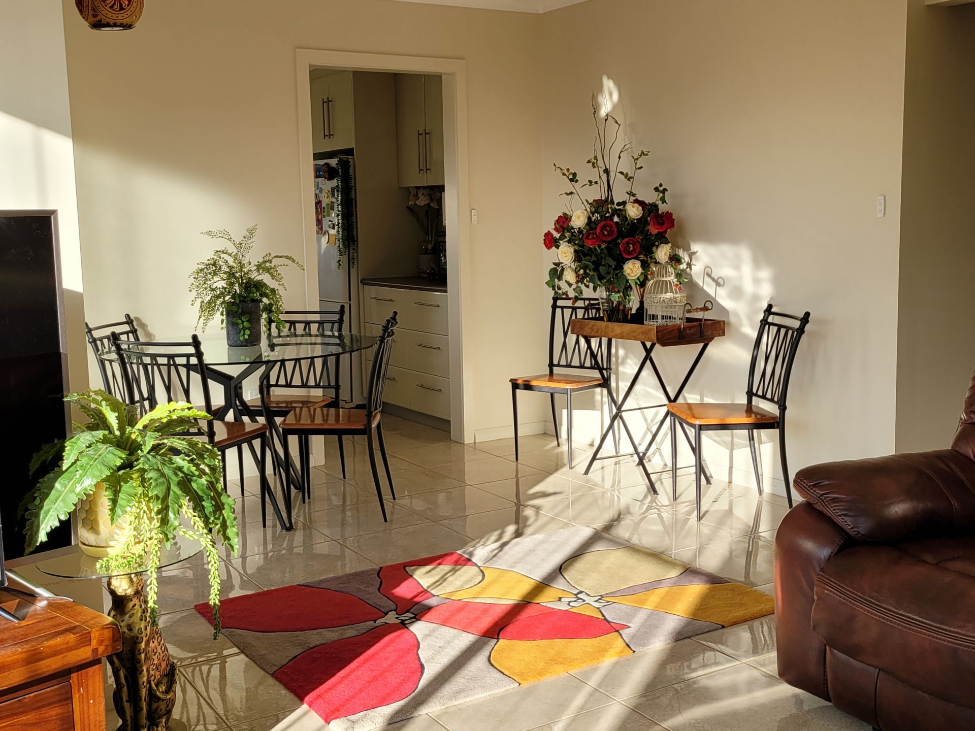 The foyer also leads to the second living space. High gloss tiles feature throughout the renovated one bedroom apartment, except for the bedroom which is carpeted. It has built-ins and large windows overlooking the weeping cherry tree on the front lawn. Off the hallway is a modern refurbished bathroom including a toilet area and laundry facilities. The hallway opens to a light-filled open plan area with a reverse cycle heat pump and big windows overlooking the backyard. The combined lounge and dining areas lead to the kitchen. The modern kitchen has soft-close cabinetry and lots of storage. Through the kitchen is access to a remote-controlled internal single car garage with built-in cupboards, shelves and more laundry solutions. The sliding door off the dining area opens up to an east-facing patio that catches the morning sun and is perfect for eating alfresco. On long summer evenings it is barbeque-ready and overlooks the backyard and enclosed vegetable garden.