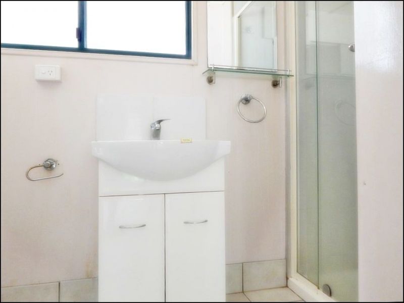 Bathroom is central to all rooms, it has a pivot door shower, vanity plus a mirror and toilet, linen press is just outside the doorway.