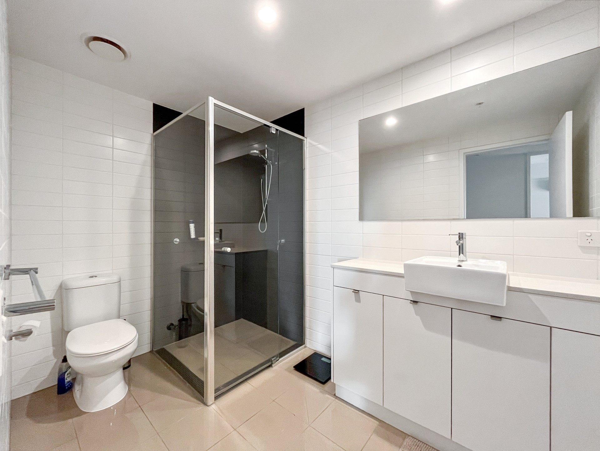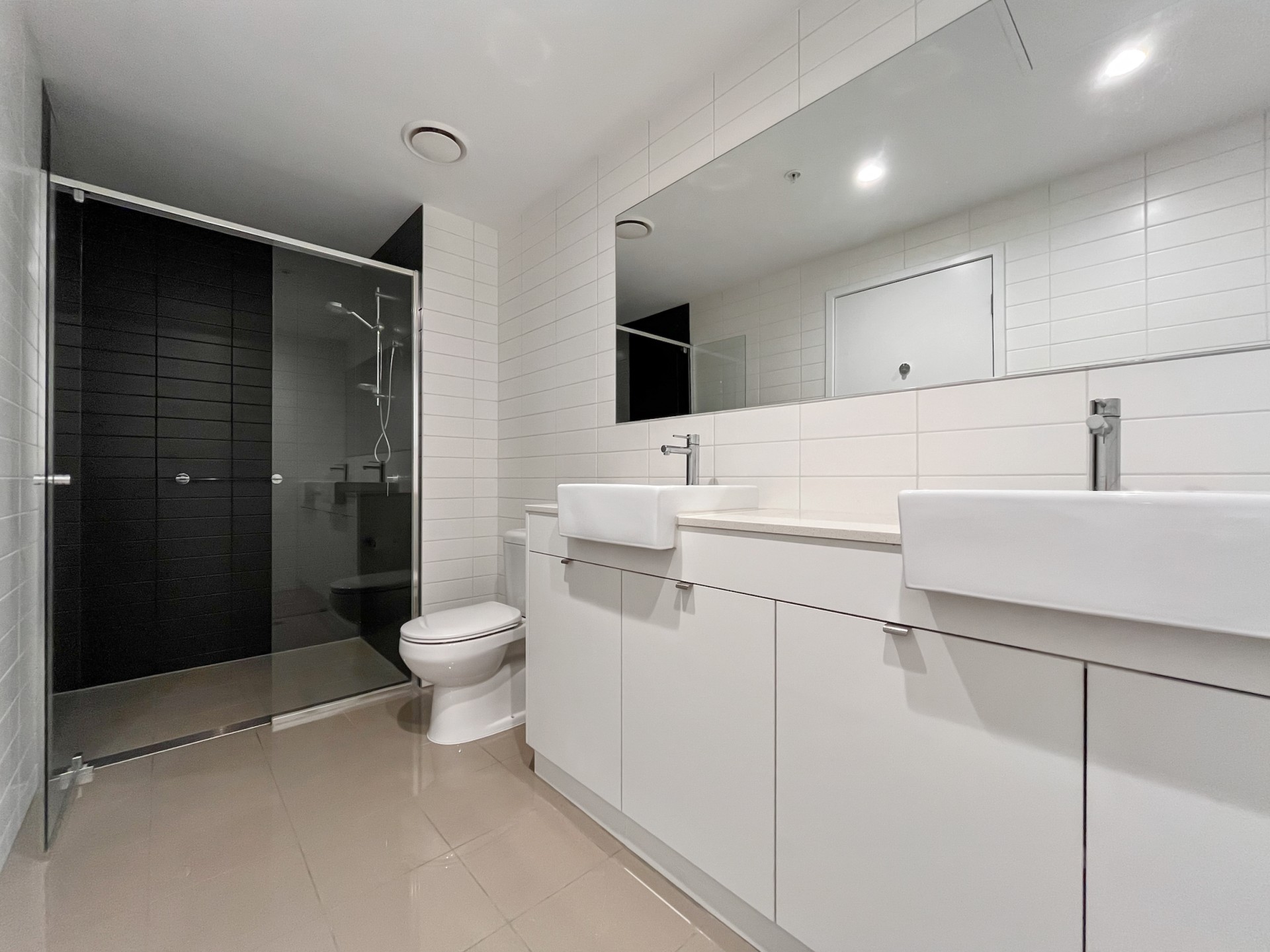 - Wall-to-ceiling tiles in both bathrooms and stone benchtops