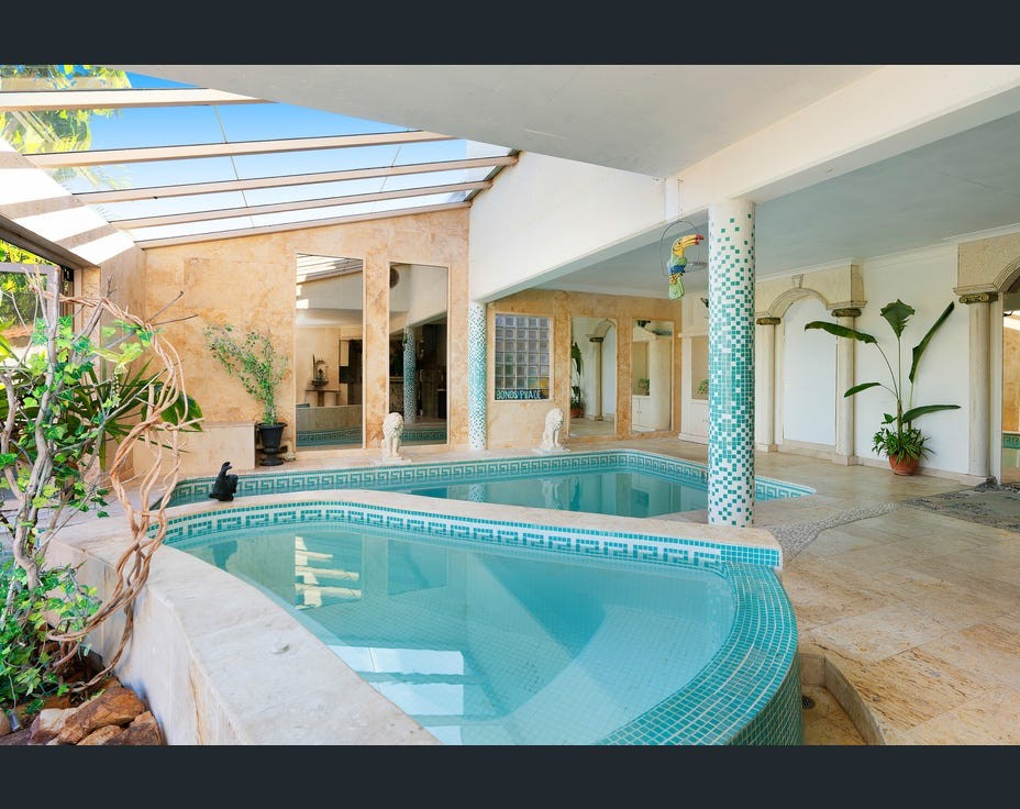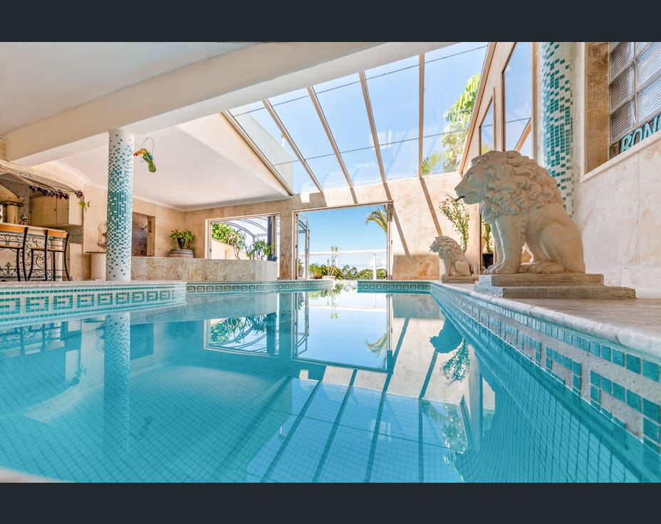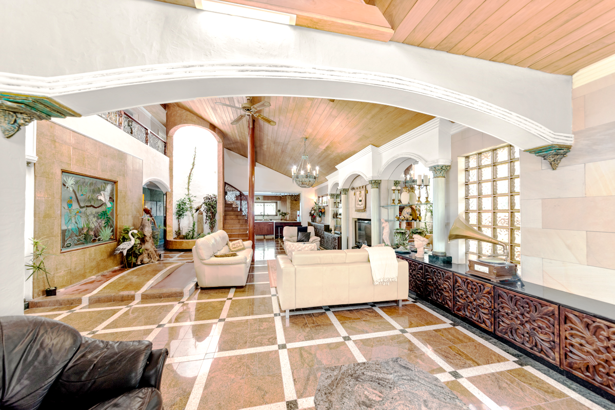 This property presents multiple living zones, accessible internally and externally including 3 kitchens. It also features an indoor/outdoor pool, providing a private oasis, complete with a bathroom and bar. The house itself is solidly built with concrete slabs, showcasing exquisite custom granite and natural stone flooring throughout.
