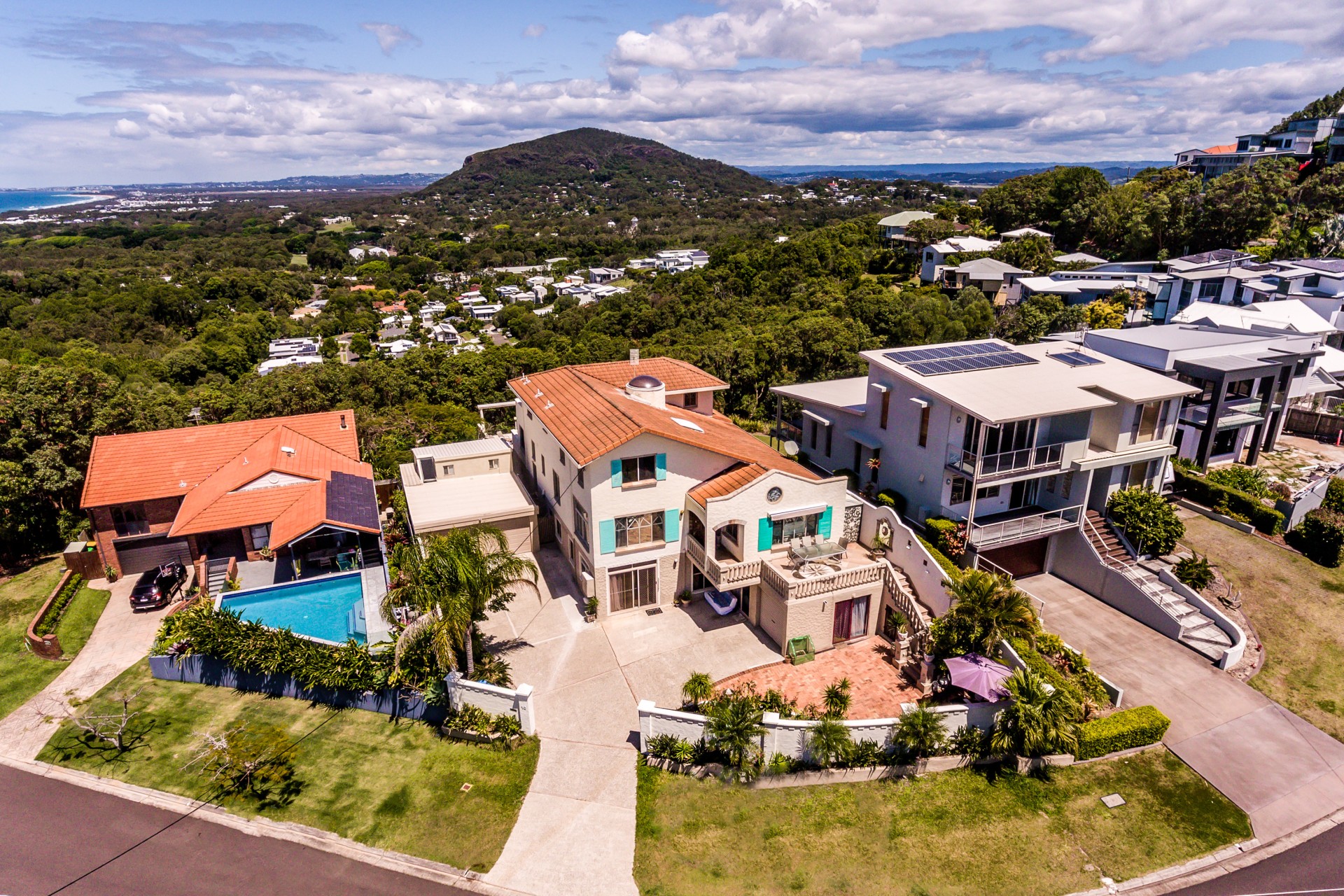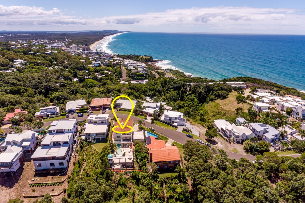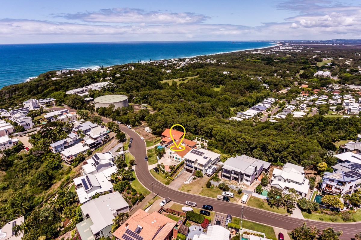 Perched 60m above sea level in a prestigious cul-de-sac above Third Bay, this residence boasts unrivalled panoramic vistas. From Noosa in the northwest to the stunning beaches and ocean views in the northeast, Mooloolaba in the south, and Mt. Coolum and hinterland ranges in the southwest, you'll be captivated by the 300-degree scenery.