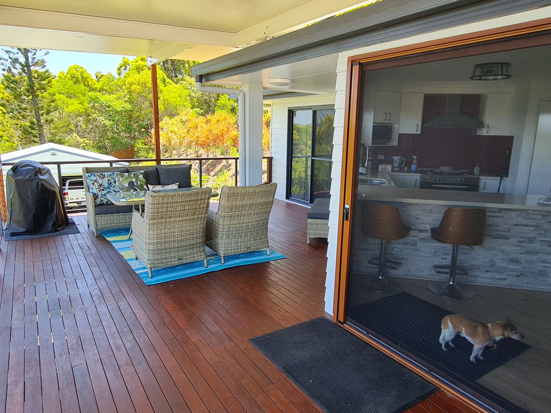 Dining room flows out through Byfold doors to large covered patio entertainment deck