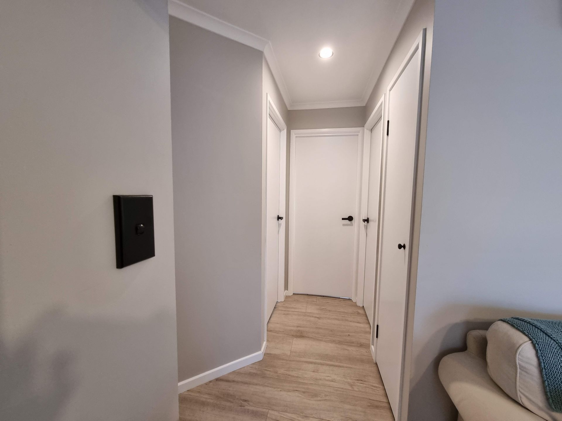 * Black accent fittings and electrical fixtures