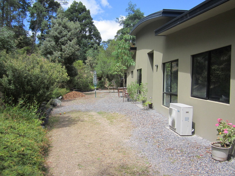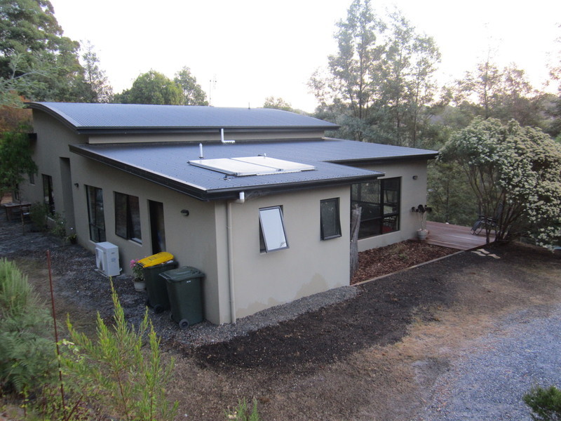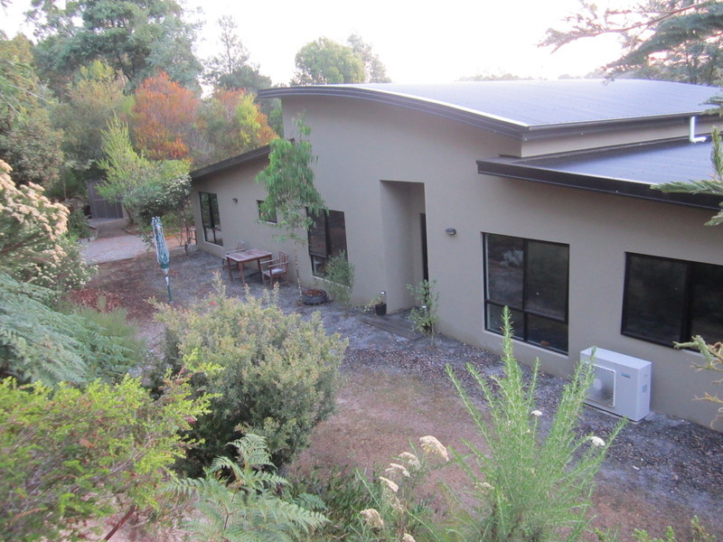 Modern design, low maintenance, quality construction and rendered residence. Open plan space- along with a modern kitchen, current use also includes dining, lounge and pool table. Reverse cycle heat pump. Double doors open to timber deck. Bedrooms - all with built ins. Bathroom--large bath and shower spaces. Separate office/study and media/library spaces - either potential for 4th bedroom. Solar boosted hot water. Town water to house and modern grey water system takes household usage to grounds. A 10,000-gallon tank collects rainwater for garden use all year round