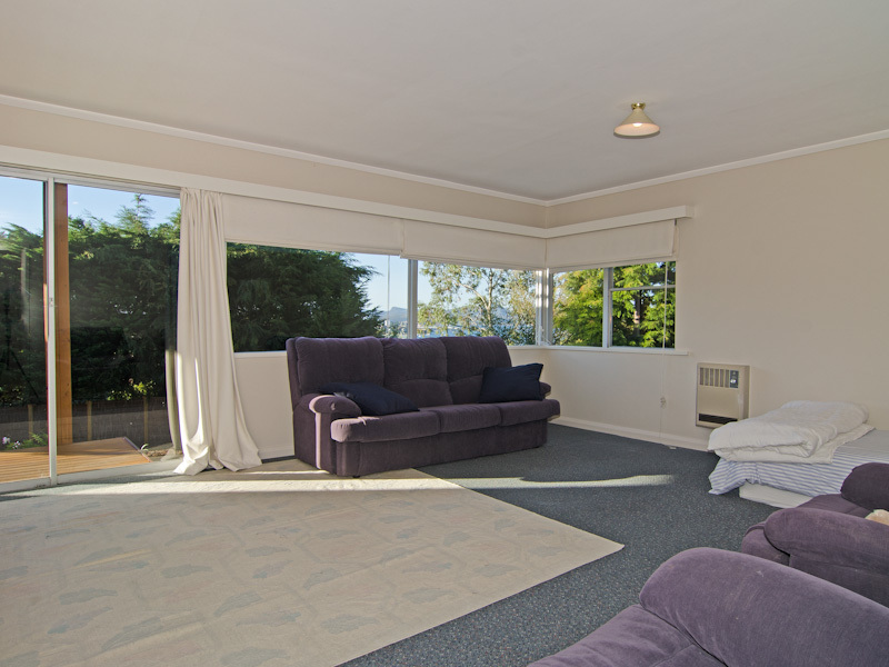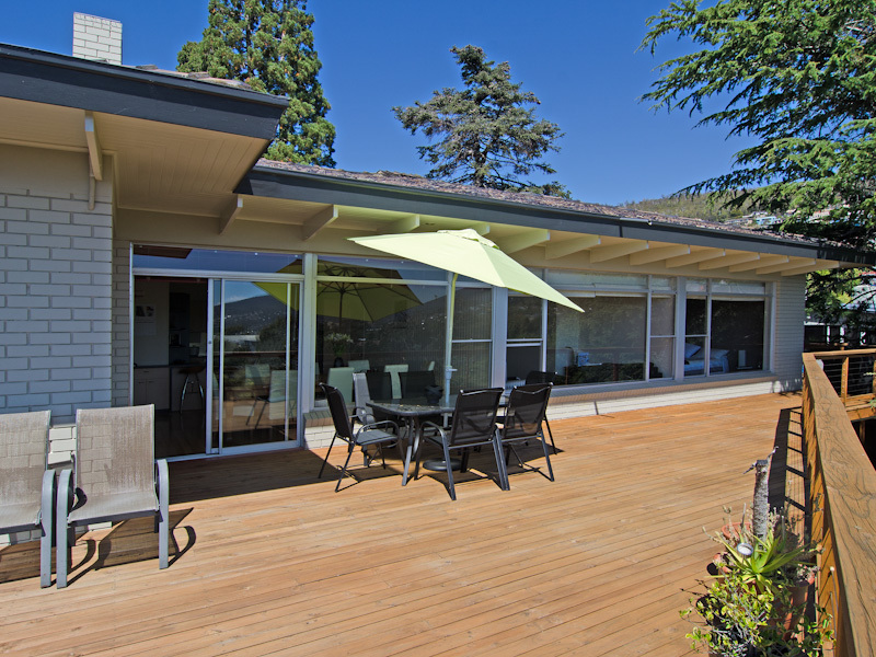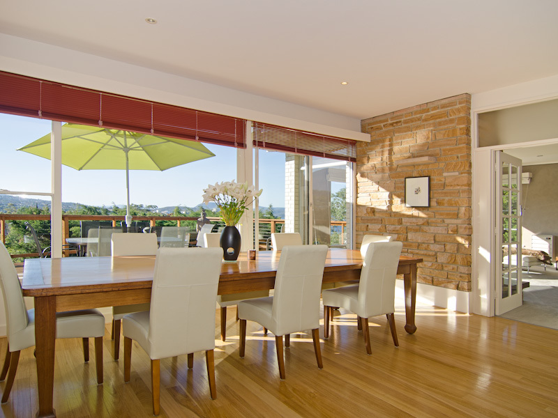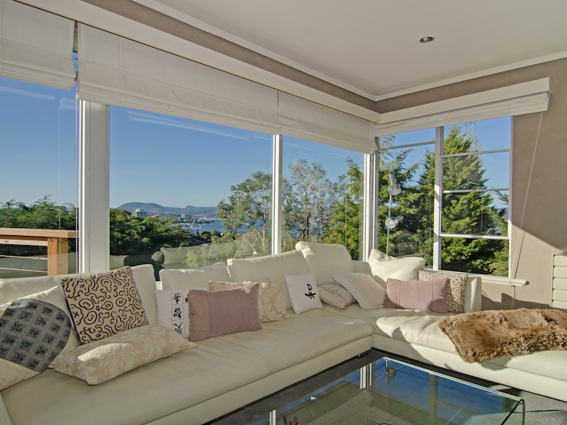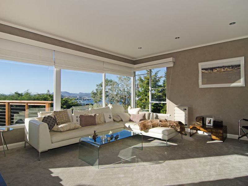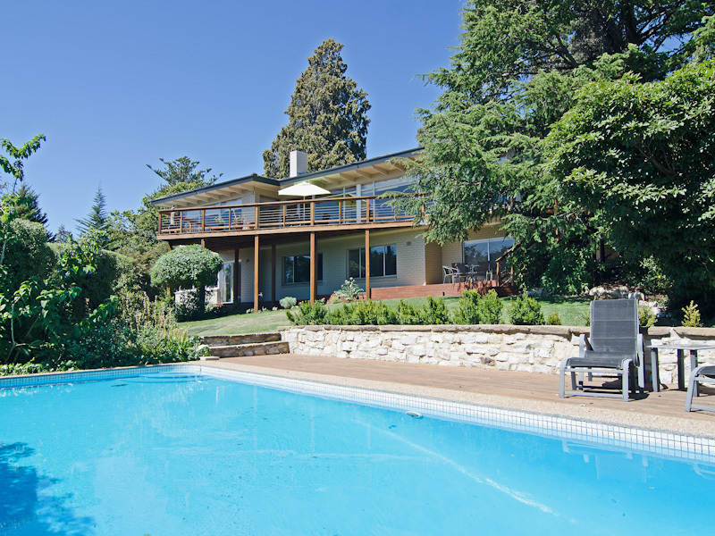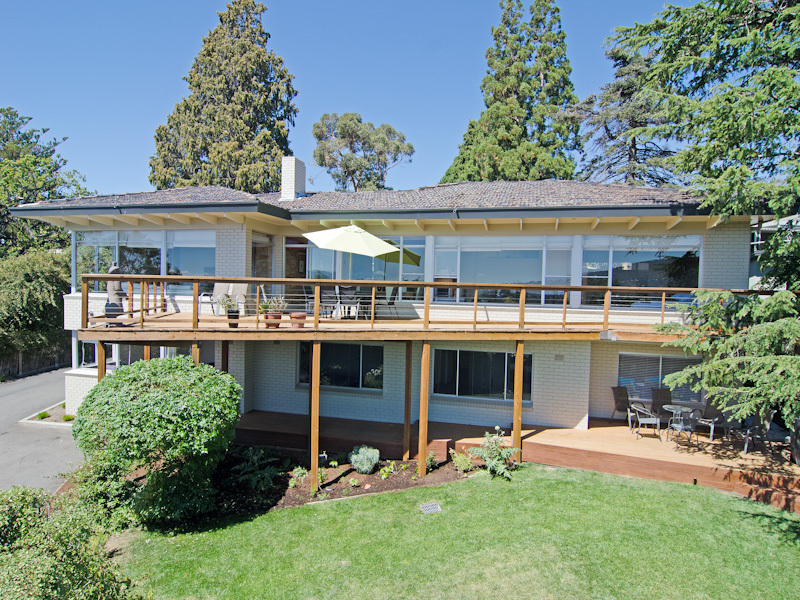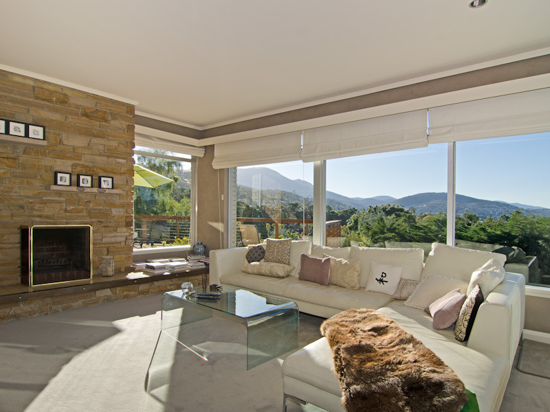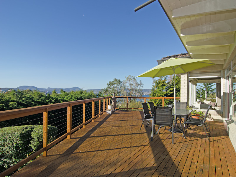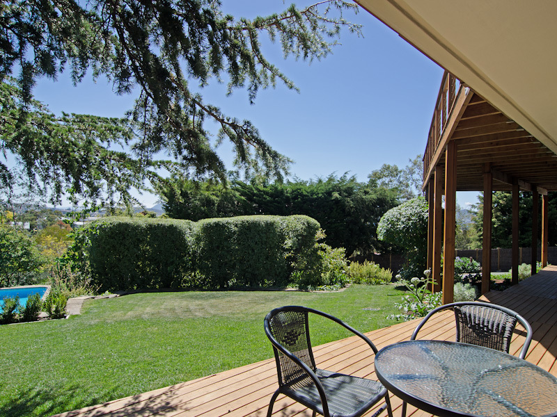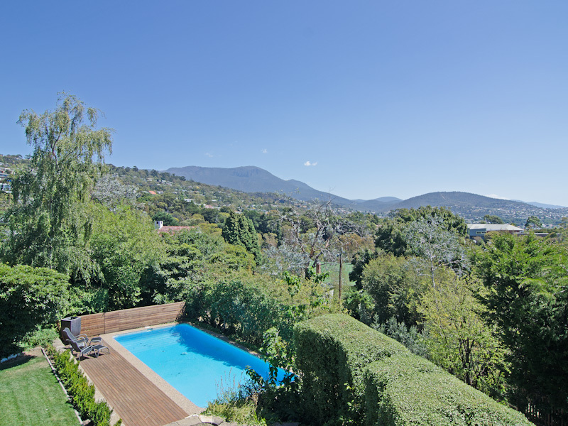 Up a private internal driveway, the north-facing house has light–filled rooms and large decks overlooking a tranquil and level garden surrounding a pool. It enjoys 270 degree vista of the river, harbour and the Mountain filtered through trees.