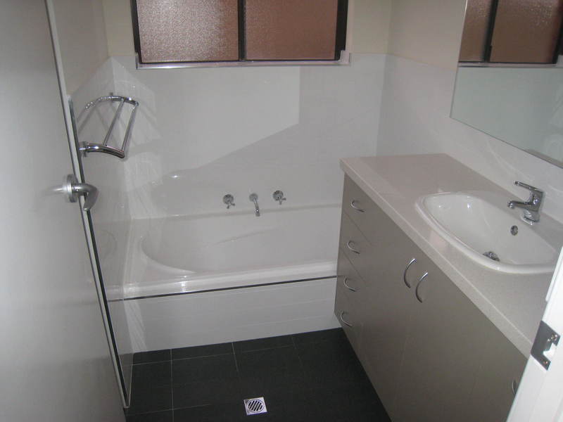 • Main bathroom with Caesar stone benchtop, bath and shower