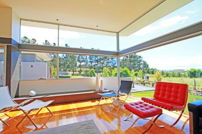 The open living area has floor-to-ceiling windows and sliding doors to a large deck area, with panoramic views of the property and gardens.
