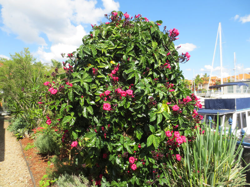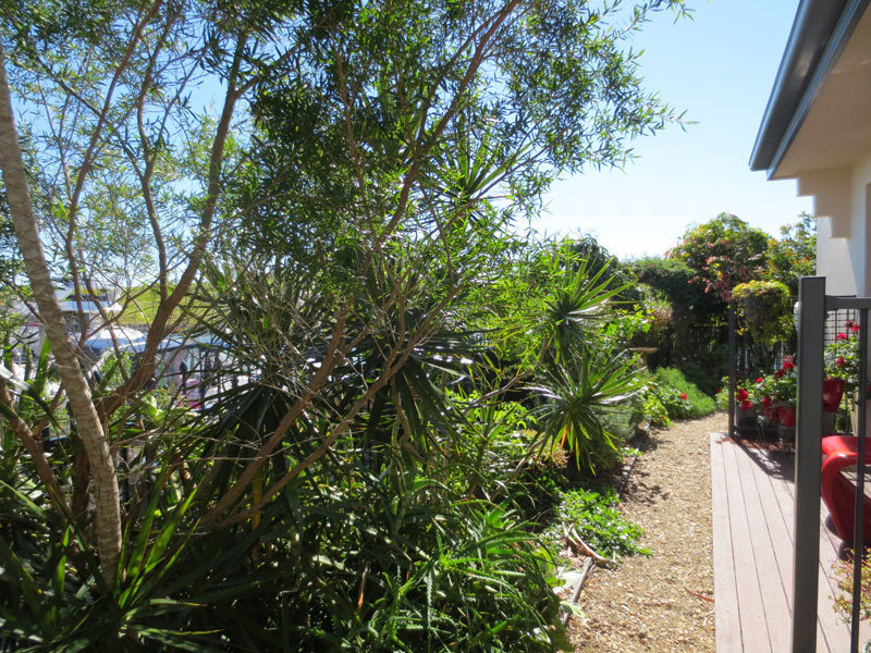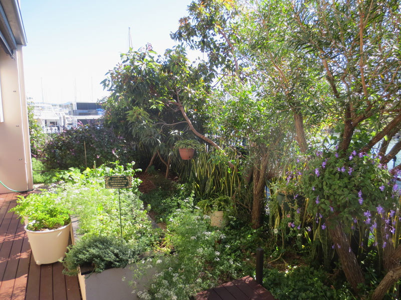 A fully fenced L shaped productive fully organic garden is bounded on two sides by the Marina boardwalk.