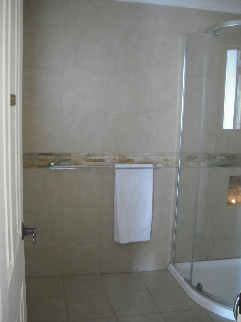The fully renovated bathroom, with floor to ceiling stone 30x30 tiles, a spacious modern glass shower and large vanity, are finished with heat lamp / exhaust and other quality fittings.