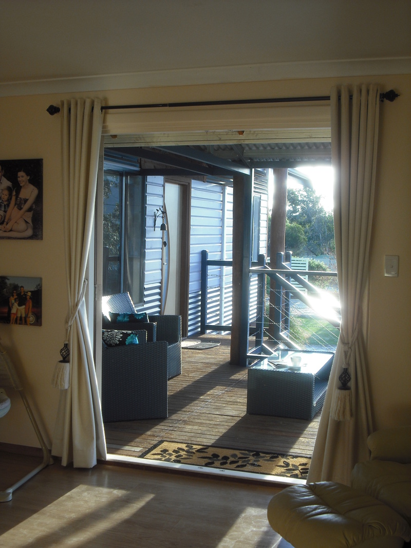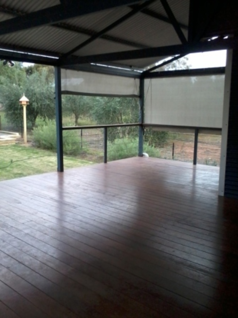 Entertain family and friends on your spacious 40sqm (approx.) back decking – completed in ‘Meerbu’ 140mm wooden boards and custom made roll-up shade/privacy blinds.