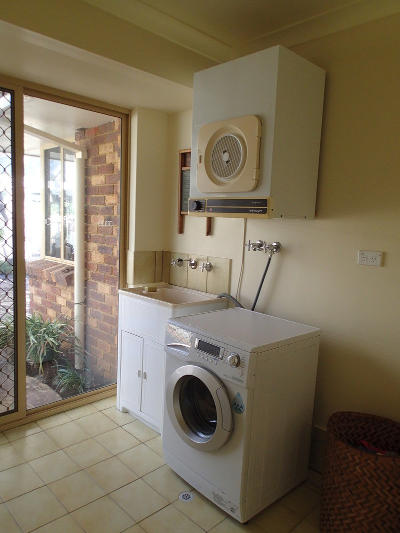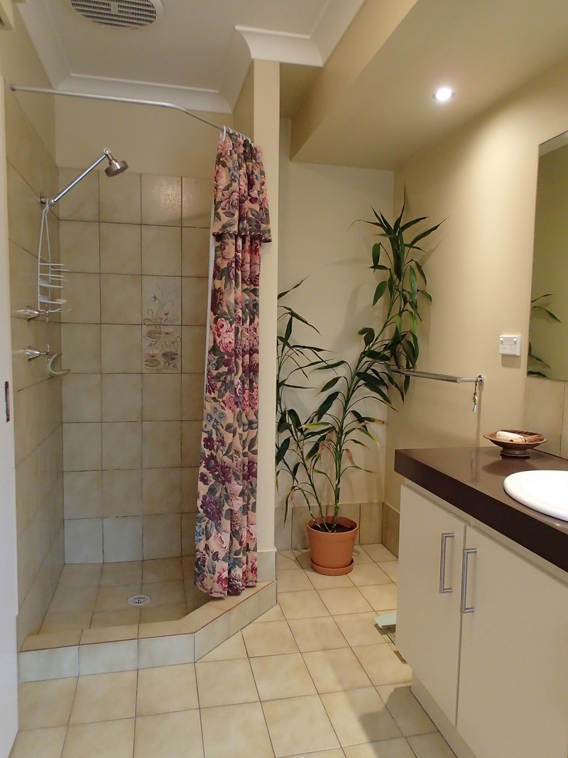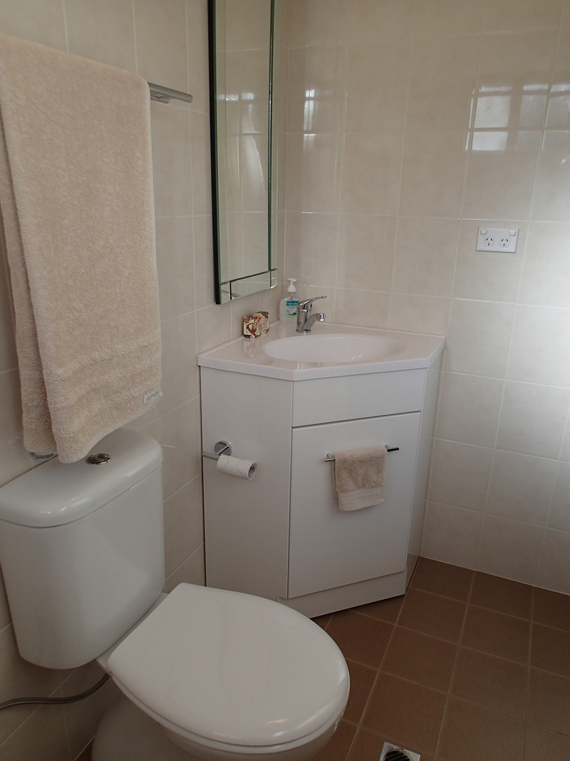 The main bathroom has a shower, bath and large vanity painted in contemporary colours. Nearby are an ample laundry and separate toilet.