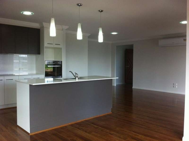 The modern kitchen overlooks the open plan dining, family and outdoor covered entertainment area. The kitchen has quality appliances and stone kitchen bench tops.